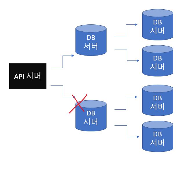 단순히 확장만 하는 것이 아니라 메인으로 사용할 Master 서버와 이를 복제한 Slave 서버로 구성하게 된다. Master와 Slave로 구성된 구조를 자세히 살펴보면 Master 서버에는 INSERT, UPDATE, DELETE 작업이 전달되고 Slave 서버에는 SELECT 작업이 전달되는 것을 볼 수 있다. Slave는 결국 Master 서버에서 복제된 데이터이기 때문에 데이터의 조작이 발생할 수 있는 INSERT, UPDATE, DELETE 작업은 Master로 전달이 되고 조회만을 하는 SELECT 작업은 Slave 서버를 통하여 진행하게 된다. 그림에서는 Slave 서버가 하나뿐이지만 서비스에 맞게 Slave 서버를 여러 개 가져갈 수 있다. 데이터베이스에서 발생하는 대부분의 쿼리는 조회인 SELECT인데 이러한 것을 Slave 서버틀 통해 분산처리하여 성능 향상을 야기한다.