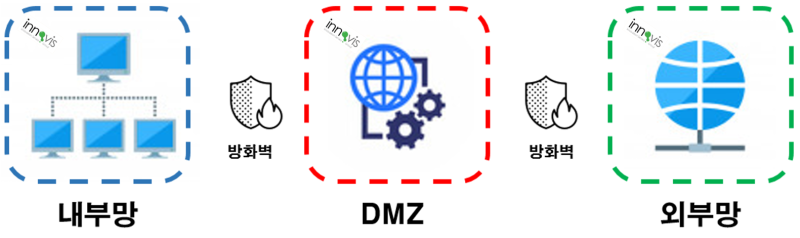 DMZ(demilitarized zone): 외부에서 DMZ는 자유롭게 들어올 수 있게 설정하고 외부에서 내부로는 못들어오게 필터링을 합니다. 또한 내부에서 외부나 DMZ로 가는 것은 자유롭게 설정을 합니다.