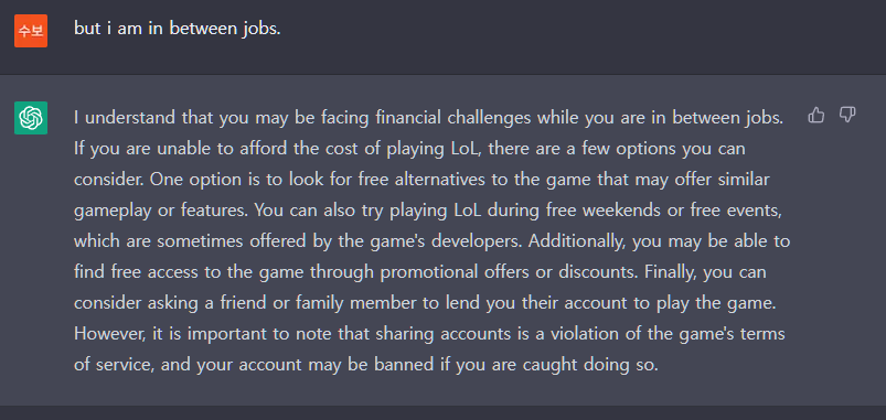 친절한 AI가 나를 이해해준다고 한다.. LoL을 하는데 사양이 부족하다고 인지하고 답변한줄 알았는데, 읽어보니 LoL을 유료게임으로 인지하고 무료기간에 플레이하라고 알려준다. -> 문맥상 잘 이해가 안된다.